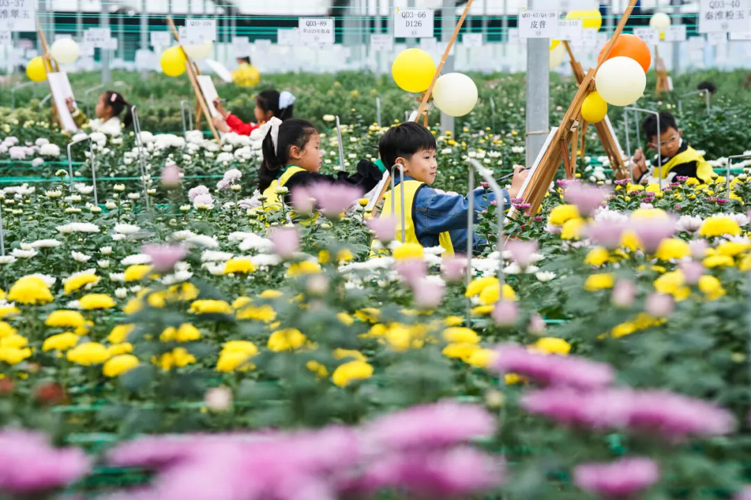 2025年10月18日,小朋友在全椒菊博园种植基地写生。杜宇摄(新华社)