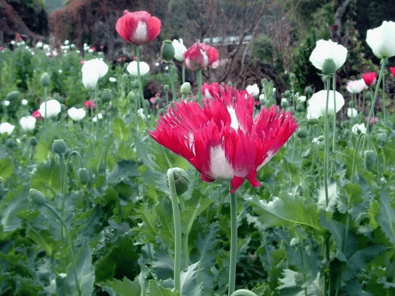 罂粟:一年生草本植物,株植花梗粗壮,光滑无毛。花朵颜色鲜艳(红、粉、白、紫等)近似扇形,果实呈球状或椭圆状。
